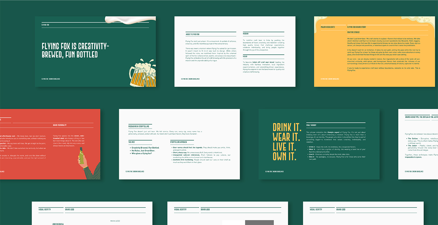 A disciplined layout that could stretch across formats and flavours. Within this structure, we introduced illustrated fox characters, each designed to reflect the personality, mood, and taste profile of its beer. Every label follows the same system, yet no two bottles feel the same. The illustrations shift. The colours evolve. The fox adapts. What stays constant is recognisability on shelf.